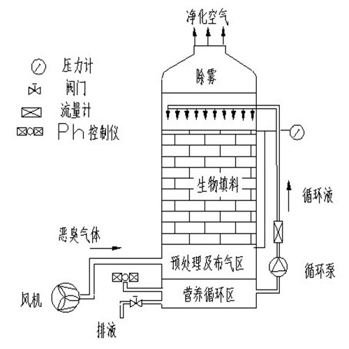 微生物除臭是利用微生物細胞對惡臭物質的吸附、吸收和降解功能,對臭氣進行處理的一種工藝。主要過程如下:通過收集管道,抽風機將臭氣收集到生物濾池除臭裝置,臭氣經過加濕器進行加濕后,進入生物濾池池體,后經過填料微生物的吸附、吸收和降解,將臭氣成分去除。